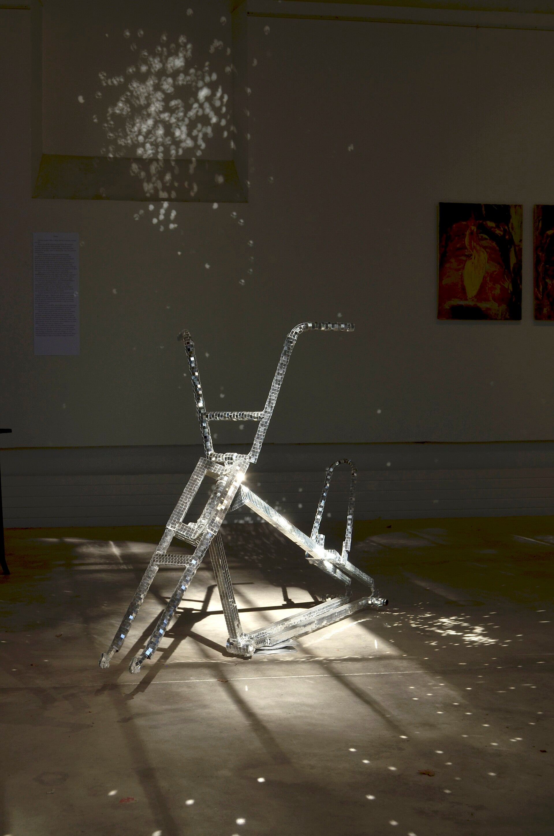 En temps qu’artiste je suis confronté depuis un certains temps au problème de conservation de mes œuvres passées. Certaines se perdent d’autres sont stockées de ci de là, autant de fragments à la dérive dans le flux du temps. Ces deux dernière années n’ont pas été fructueuses pour moi (ni pour le reste du monde), j’ai douté à de nombreuse reprise de mon statut d’artiste. Est-on encore un.e artiste lorsque l’on arrête de produire ou de montrer sont travail ? Devient-on invisible ? Au fond quelles traces restera-t-il de tout ça ? Pour lutter contre ces questions et l’angoisse qu’elles charrient, j’ai imaginer une réponse : convoquer l’univers de la fête en cristallisant d’anciennes sculptures sous une seconde peau de facettes. Comme une sorte de « mycélium funky » qui engloberait et digèrerait ces fragments d’oeuvres passées, cette chrysalide à facettes les ferait briller une dernière fois. Un peu pour célébrer le lâché prise propre à la fête, j’ai intitulé cette esquisse de projet « foutu pour foutu ». Cette mutation festive est un pied de nez au pessimisme. Elle nous permet de nous extraire, mes travaux et moi, d'un poid grâce au mouvement et à la lumière.